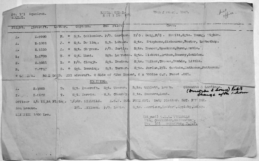 The Order of Battle (Orbat) for 101 Squadron for the evening of Tuesday 20th January 1942. The crew of Z1110 (Chapman, Curtis, Hancox, Spackman, Dunn and Mantle) were the only one of the six that failed to return. There has been no news of the bodies or the aircraft for 76 years (Photo: Tom Curtis)