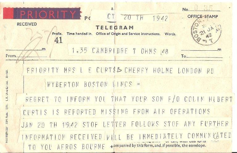 The telegram received by Colin`s mother on the 21st January 1942 after his Wellington failed to return from a mission the previous evening (Chapter 16)