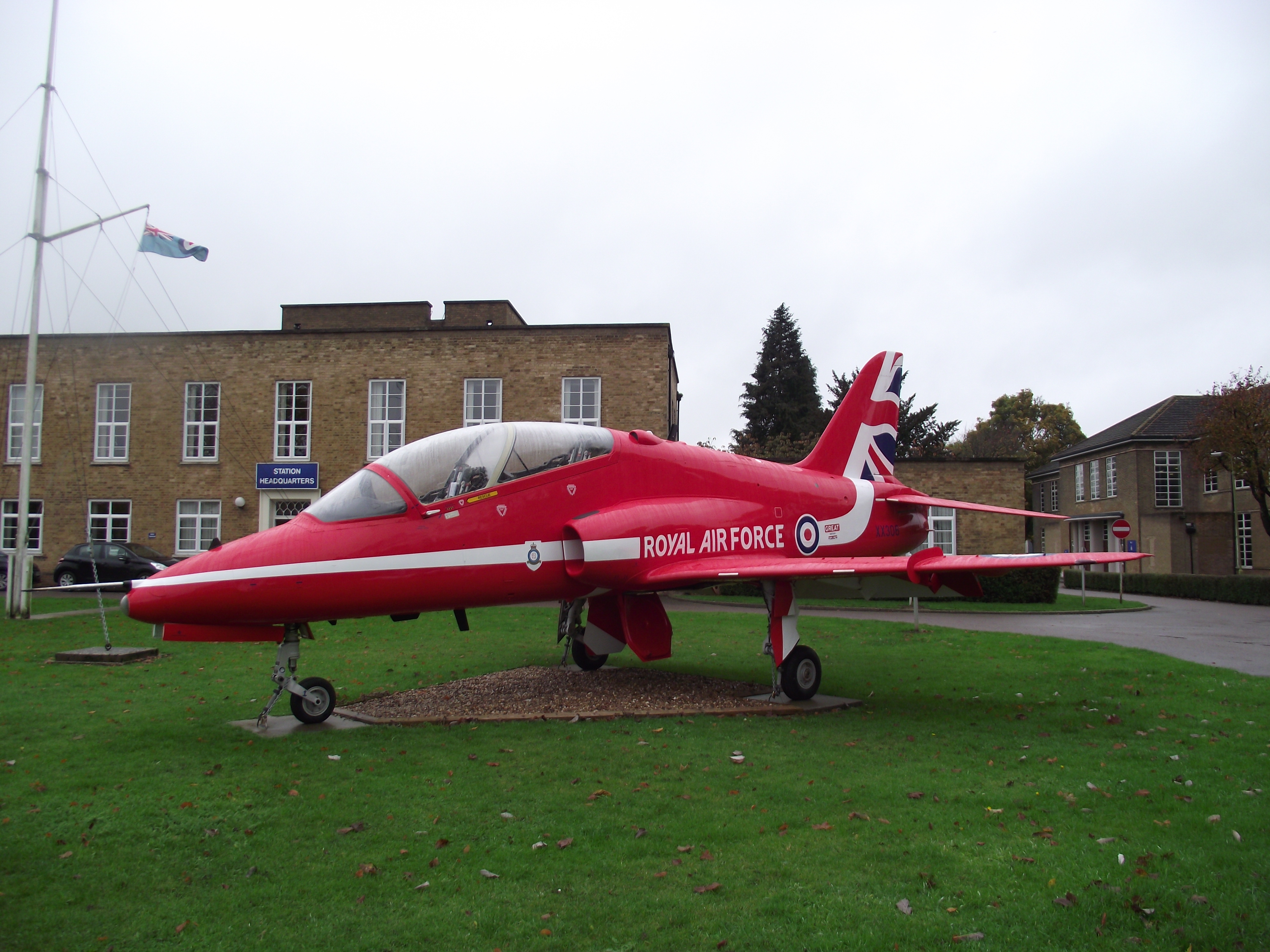 Red Arrows Hawk XX306 – the aircraft in which MC had a flight to Norfolk and back in 1992. The aircraft was brought out of storage and installed as gate guardian at Scampton in 2015. It is front of the Station Headquarters and visible from the A15 (Chapter 22) (Photo: MC)