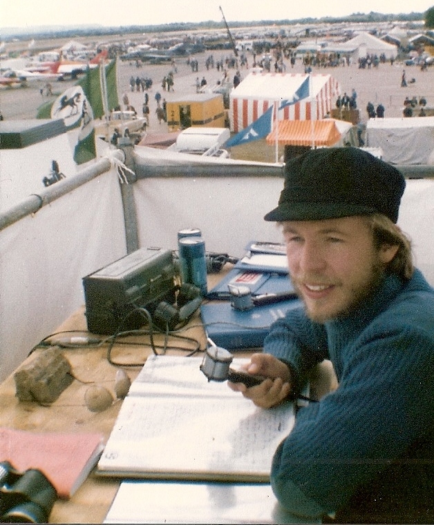 Our man on the IAT commentary tower with a lip-mic, a phone link to the tower, two cans of lager (gifts for visiting display team commentators), and a small rock paper-weight. Corduroy caps, as seen on the cover of Dylan`s debut album, were very fashionable in 1981 (Editor: Are you sure?)