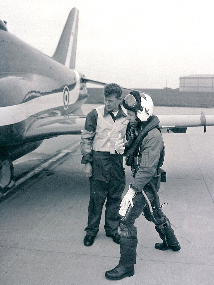 Can I have some steps? A helmeted, booted, g-suited MC makes a determined stride towards the Red Arrows Hawk ahead of an hour`s flight to Norfolk and back May 1992 (See Chapter 22)