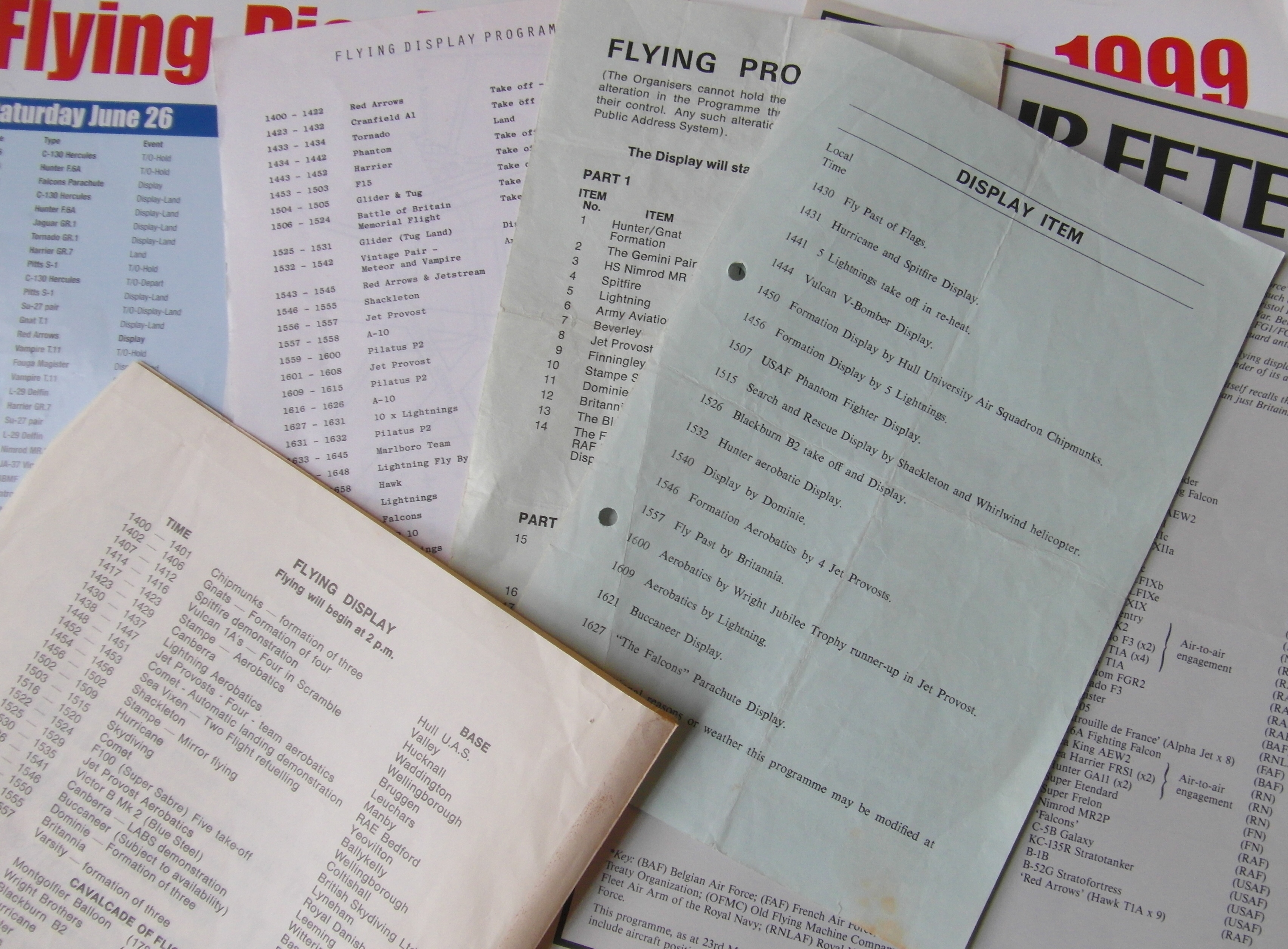 Flying display programmes – Finningley 1966, Binbrook 1982, Topcliffe 1972, Leconfield 1968, Mildenhall 1990 and Waddington 1999.